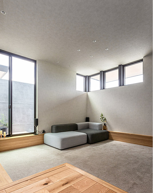 ダイニングキッチンとゆるやかに空間を分けたロースタイルのリビング。3m8cmの天井高は縦の開放感を生み、畳數以上の広さを感じられます。壁上部にはコーナー窓を設け、道路からの視線を遮りながらも空に視線が抜けることで居心地を高めています。また、連続窓を一體的に見せるディテールの工夫により、周囲の壁をすっきり美しく見せています。