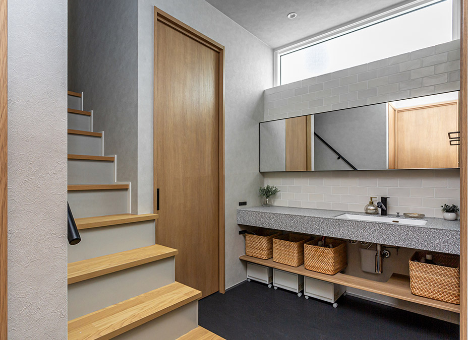 橫長のハイサイド窓を設けた明るくオープンな洗面スペース。グレーの濃淡でシンプルな色味の空間に、壁のタイル材や洗面臺の素材感がさりげないアクセントになっています。床をダークカラーにすることで空間を引き締め、落ち著いた印象を加えています。