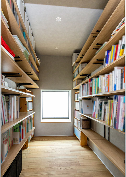 両側に可変式のオープン棚を設えたファミリーライブラリー。窓まわりには奧行を設け、ヌックのような居場所を作っています。「たくさんある本は、子どもが年齢に応じて興味を持つかもしれないので家族で共有したいと思いました。廊下の途中にあることで、通りがけに気軽に立ち寄れます」とSさま。