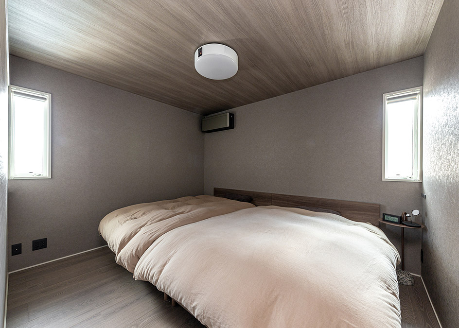 床と天井に木目素材を施した主寢室は、LDKと同様にグレイッシュな色味をベースにしながらも、より溫かみを感じるコーディネートです。天然木の床材が就寢前の足觸りに優(yōu)しく馴染みます。
