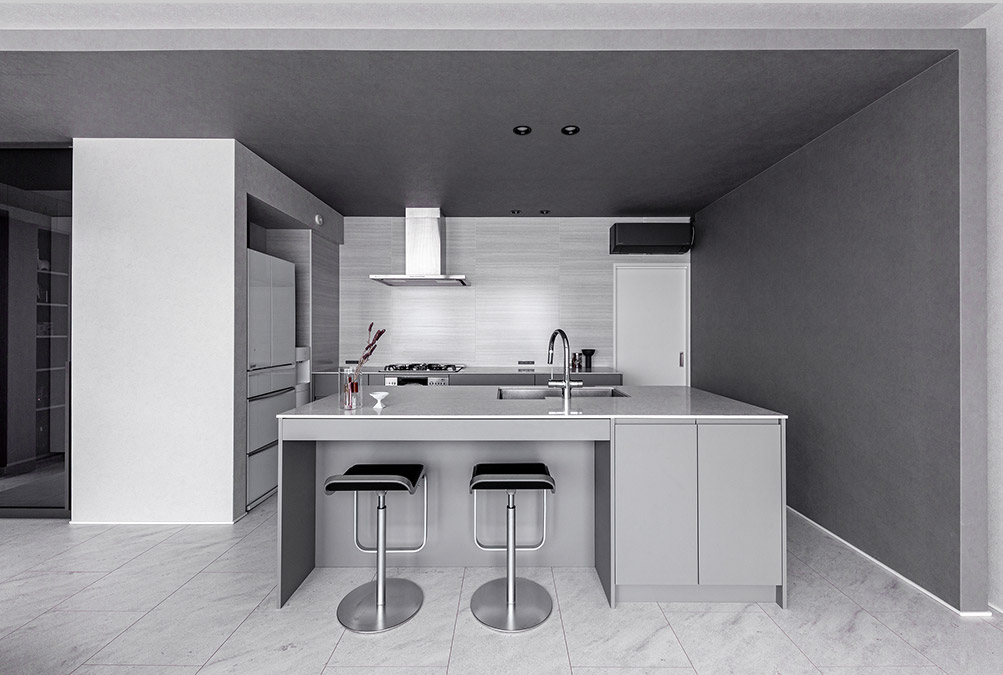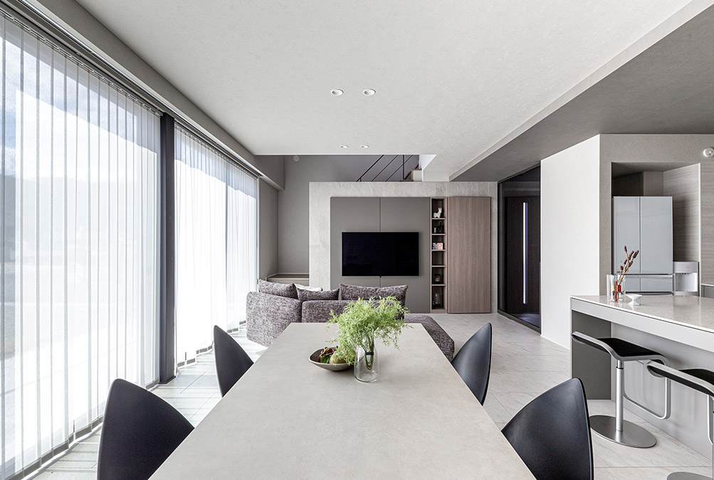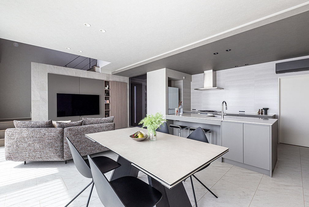大勢で美味しいものを囲む時間が大好きだとおっしゃるUさま。家族や友人が集まって賑やかに過ごす際は、たくさんの手料理でおもてなしをされるそうです。そんなシーンも想定して、ご新居にはアイランドキッチンやダイニングを中心とした開放感あるLDKを望まれました。使い勝手の良さはもちろんのこと、インテリアには遊び心あるデザインアイデアが満載。淡いグレーを重ねるように構(gòu)成した空間は、大開口から入る光の陰影と心地よく調(diào)和し、スタイリッシュな裝いながらも柔らかい雰囲気が漂います。明るいUさま家族の溫もりに満ちたお住まいです。