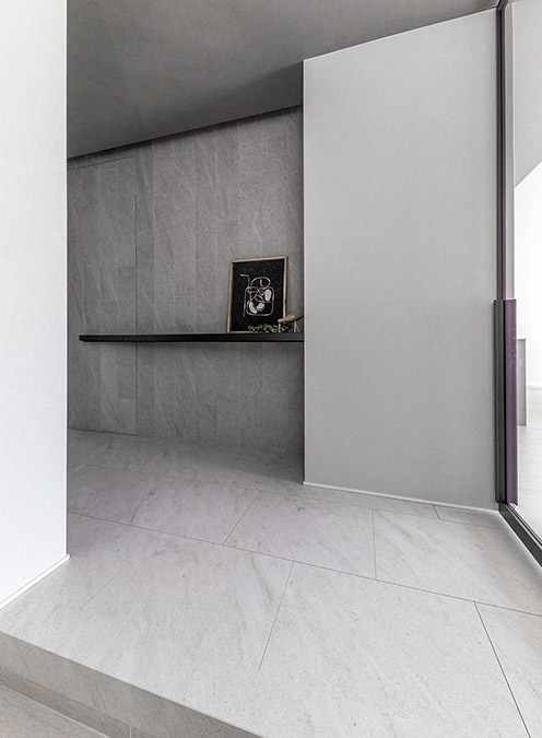 リビングとガラス扉でつながる玄関は、正面の壁にリビングのテレビ背面壁と同様、幅広のタイルを縦張りしています。小物が飾れるカウンターを設(shè)けたこの壁の一部は、事務(wù)スペースへつながる隠し扉。扉を壁のデザインに溶け込ませることで玄関デザインの一體感を高め、空間を広く見せる効果もあります。