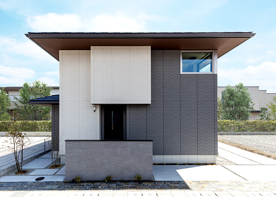 コントラストのある2色の外壁が主役の外観。正面の窓は2階(吹抜け)のコーナーだけに抑えたことで、壁のデザインが一層美しく見えます。また、寄棟屋根の軒天には羽目板柄を取り入れ、外壁素材とメリハリをつけることで、軒の奧行感が際立っています。