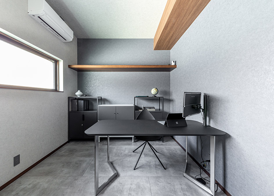 事務(wù)スペースはモノトーンですっきりまとめて機能性を重視。右上部の下がり天井と奧のオープン棚は、木目で揃えてデザインのアクセントにしています。