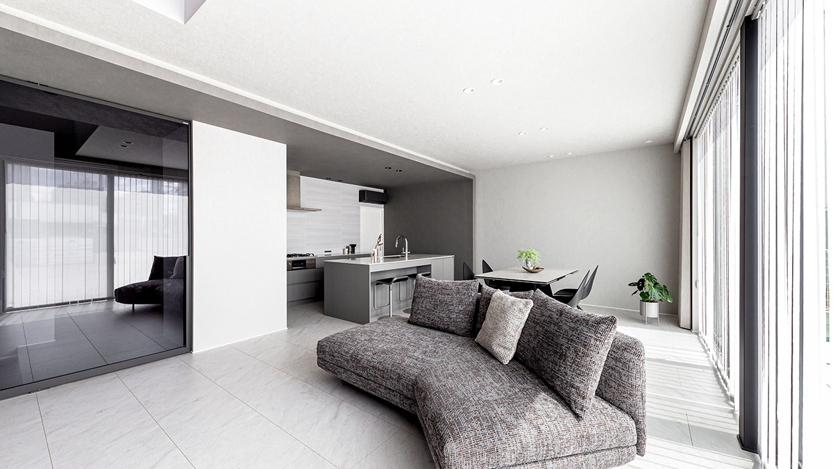 大開口から光が入るグレーベースのLDK