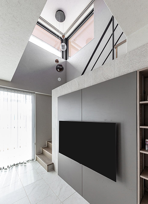 LDKに入ると、大開口から外への開放感が得られると同時に、吹抜けから上部へも視界が広がります。リビング階段の上り口では上部のペンダント照明とコーナー窓を見上げ、途中ではLDKが見渡せます。視線の移り変わりが自然に誘導(dǎo)され、階段を上り下りするたびに気分が高まります。