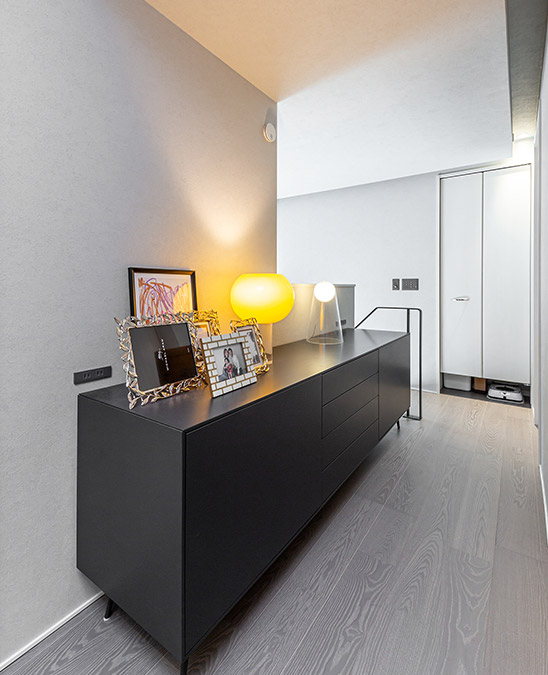 2階の廊下幅を広めにとり、お持ちのキャビネットを活かしてプライベート感のあるギャラリースペースを作りました。ここには思い出の寫真などを個性的な照明と共に展示。通りかかるたびに溫かい気持ちになれる廊下です。
