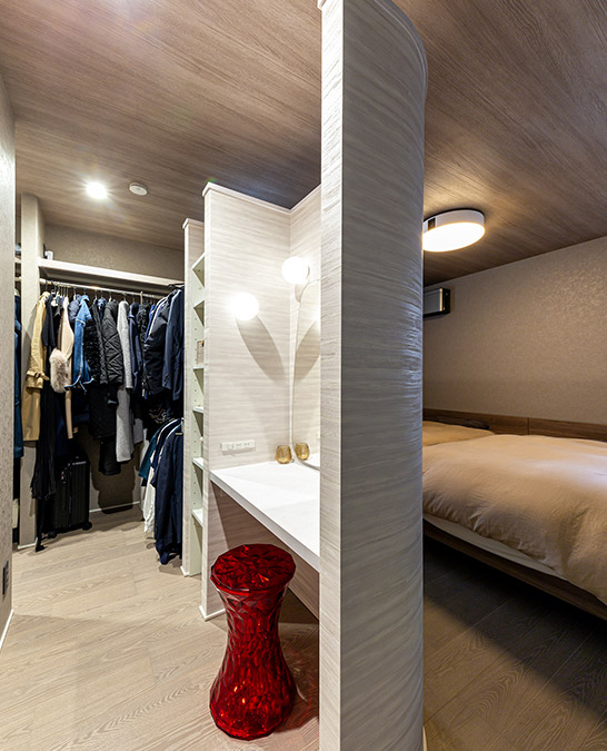 主寢室と天井がつながるオープンタイプのファミリークローゼット。入口正面の間仕切り壁をアール形狀にすることで緩やかにスペースを分け、壁の圧迫感を軽減しています。アール壁の內(nèi)側(cè)を利用した化粧臺は、変形ミラーやボール型のブラケット照明でデザインしました。