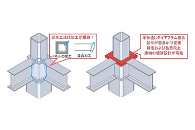 積載荷重が大きく、大空間の建物に適した、鉄骨梁が柱梁接合部を貫通する混合構造技術