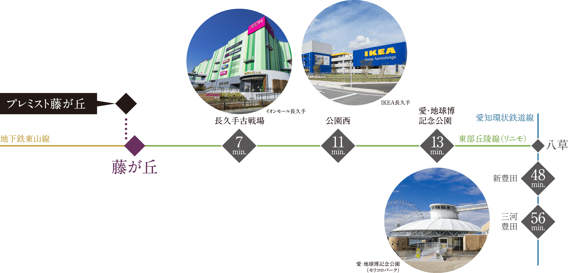 東部丘陵線(リニモ)始発駅。「藤が丘」駅を始発駅として、長久手市、豊田市を結ぶ東部丘陵線(リニモ)を日常の交通機関として利用できます。「イオンモール長久手」へのショッピング、「ジブリパーク」を楽しめる「愛?地球博記念公園(モリコロパーク)」へ出掛けるのに便利です。