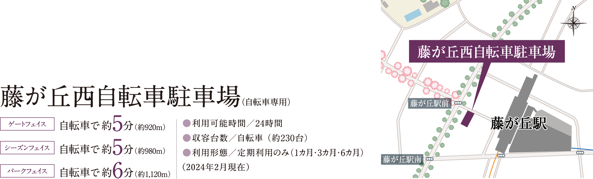 自転車で快適にアクセス。24時間対応の「藤が丘西自転車駐車場」は、定期利用ができ、屋內にあるため駐輪時に、雨に濡れる心配もありません。通勤?通學はもちろん、休日のお出かけも駅まで自転車で軽快に移動できます。