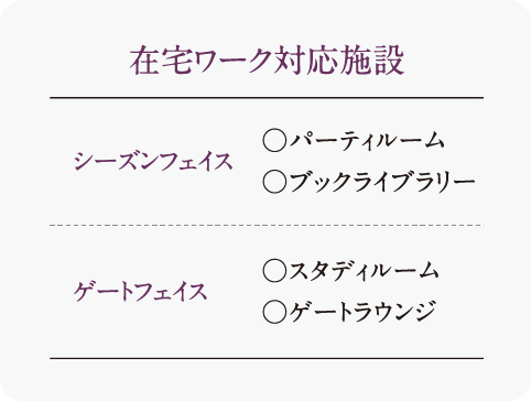 在宅ワークスペースとなる空間をご用意。ライフスタイルの変化により在宅時間が増加し、ワークスペースの必要性など住まいに求められる価値も変わってきています。「プレミスト藤が丘」では、Wi-Fi環境が整った共用部に、ワーク&スタディスペースを完備。自宅外のリモートワークスペースとして、また、お子様の學習の場としてご利用いただけます。