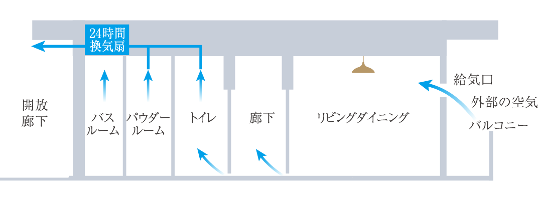 - 外部に面する居室に設置した給気口より外気を室內に取り入れ、バスルームに設置された換気扇より室內の空気を排出することで窓を閉めた狀態でも新しい空気を取り入れます。 ※給気口が設置される部屋は、係員にお尋ねください。