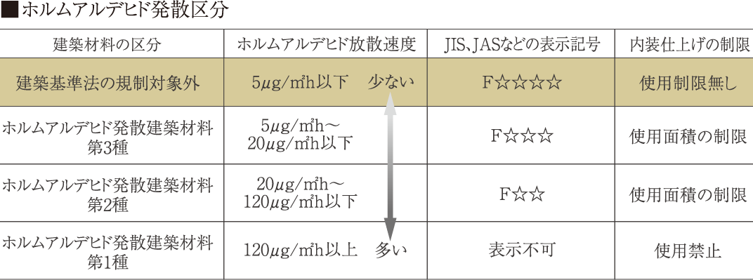 - 住宅の建材に含まれるホルムアルデヒドはシックハウス癥候群の原因のひとつとされています。ホルムアルデヒドの発散量が少ないF☆☆☆☆の建材を使用するとともに壁紙の接著剤についてゼロホルマリンタイプを採用することで、ホルムアルデヒド発散等級3を取得しています。 ※ホルムアルデヒド発散等級は「住宅の品質確保の促進等に関する法律」に基づく住宅性能表示制度の空気環境に関する評価項目。