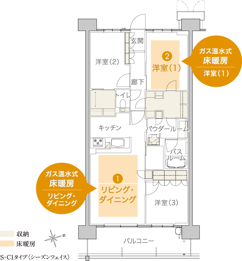 ガス溫水式床暖房を標準裝備 - リビング?ダイニングと洋室(1)の2室に、足元からムラなく暖め、空気を汚さず乾燥しにくいガス溫水式床暖房を採用しています。