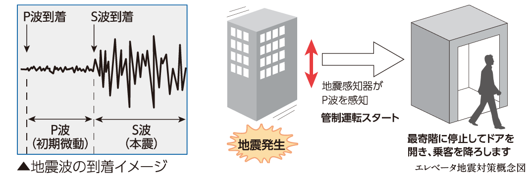 - 地震には初期微動(P波)のあと、強い揺れを起こす本震(S波)がやってきます。地震?停電対策機能付きエレベーターは、初期微動(P波)を感知した時點で最寄り階に停止し、扉が開くため早い段階で避難することができます。