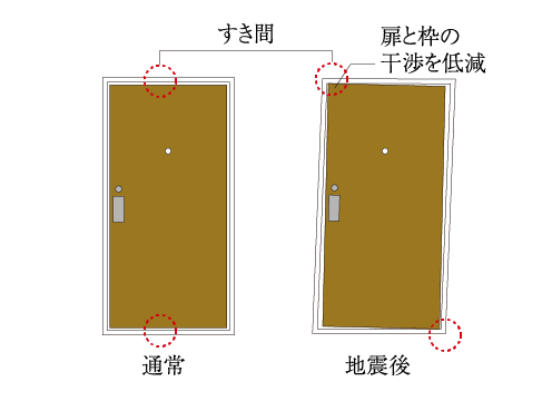 - 扉と枠のすき間を大きく確保することで、地震時に扉と枠の干渉を低減し、ドアが開放できなくなる可能性を軽減します。※想定を超える変形の場合は、開かない場合があります。
