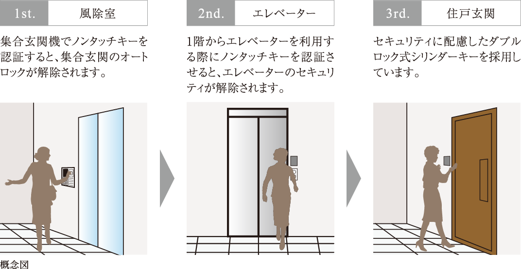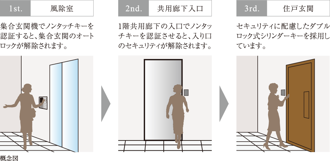 - アプローチから住戸玄関までの間に多重のセキュリティを導入。安心に包まれたセキュリティ対策を施しています。※上記は風除室を通る場合を想定したセキュリティ概念図となります。