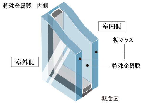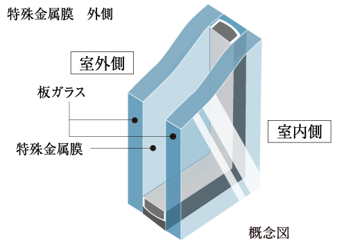 - 室內側の特殊金屬膜効果と複層ガラスの斷熱性能により室內の熱を逃げにくくします。※日射遮蔽型以外の箇所全てで採用。