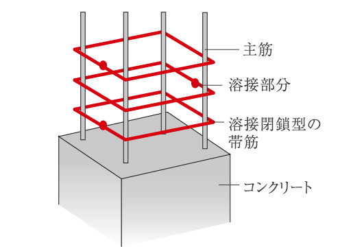 - 柱の帯筋には溶接閉鎖型の帯筋を採用しています。帯筋のつなぎ目を工場溶接したもので、現場で施工するフック加工の帯筋に比べ、地震時の柱の崩壊に対してより効果を発揮します。 ※溶接位置は設計?條件により、概念図と異なる場合があります。※概念図の為、鉄筋徑、本數等は実際と異なります。※自走式駐車場棟(シーズンフェイス)を除く。