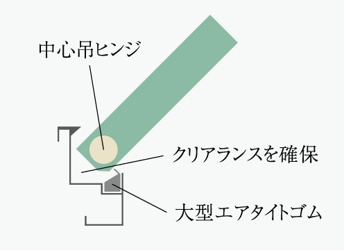 - 閉開の際に扉がヒンジを中心に回転するように、扉吊金具に中心吊ヒンジを採用。扉と枠のクリアランスを確保し、指や手が挾まれにくい構造にしています。また、このクリアランスの部分には大型エアタイトゴムを裝備し気密性と安全性を両立しています。