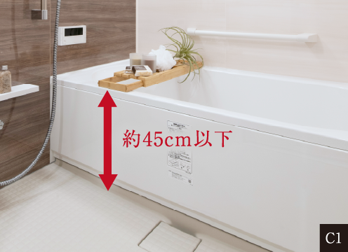 浴槽のまたぎ高 - またぎやすくするために、洗い場からの浴槽の高さを約45cm以下と低めに抑えました。