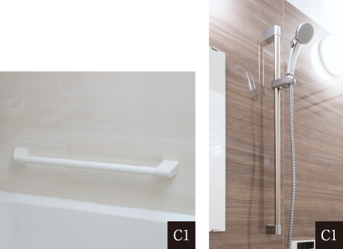 - 安全性に配慮し、浴槽に浸かる、立ち上がるなどの動作を助ける手摺を設置しました。