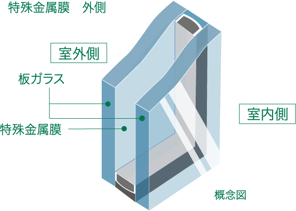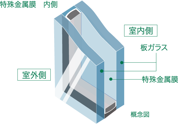 室內(nèi)側(cè)の特殊金屬膜効果と複層ガラスの斷熱性能により室內(nèi)の熱を逃げにくくします。※日射遮蔽型以外の箇所全てで採用。