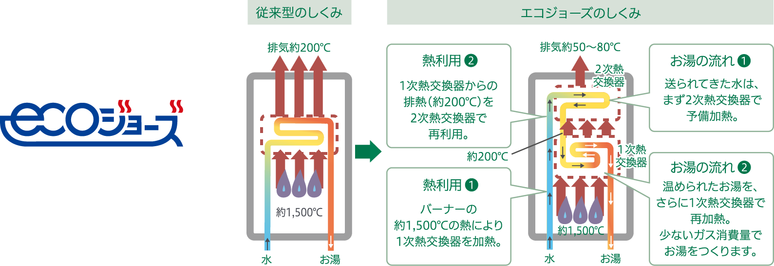 従來捨てていた燃焼ガス中の熱を二次熱交換器で回収する給湯暖房熱源機(jī)がエコジョーズ。熱効率が高い為、月々のランニングコスト、CO2排気量の低減に貢獻(xiàn)します。キッチン、バスルーム、パウダールームへのスムーズな給湯はもちろん、ガス溫水式床暖房や浴室暖房乾燥機(jī)までをトータルにサポートします。