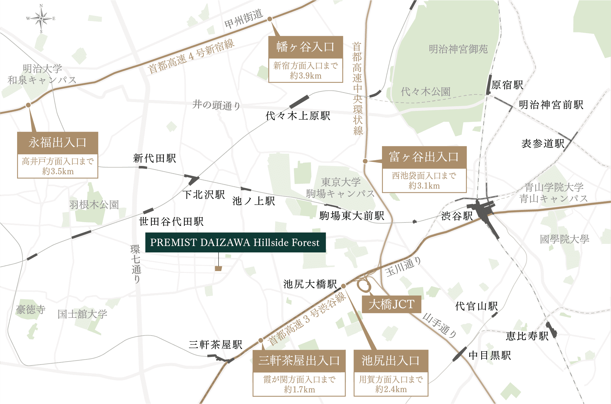 ※現(xiàn)地から首都高速3號(hào)線まで約1.4km、4號(hào)線まで約3km、中央環(huán)狀線まで約2.2km。