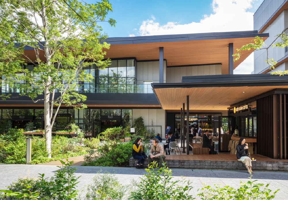 屋上に設けられた芝生のテラスや貸し農園をはじめ、インテリアや書店などの大型店舗も揃う商業施設となっています。
