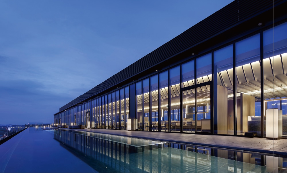 最上階に溫泉水を引き込んだインフィニティプールでは水面と空が融合した一體感と素晴らしい眺望を體験できる、ウエルビーイングを掲げるホテルとなっています。