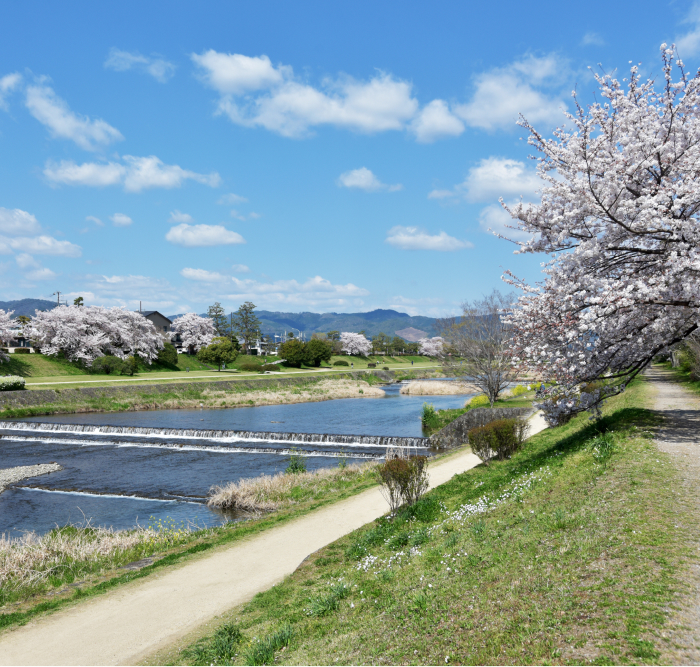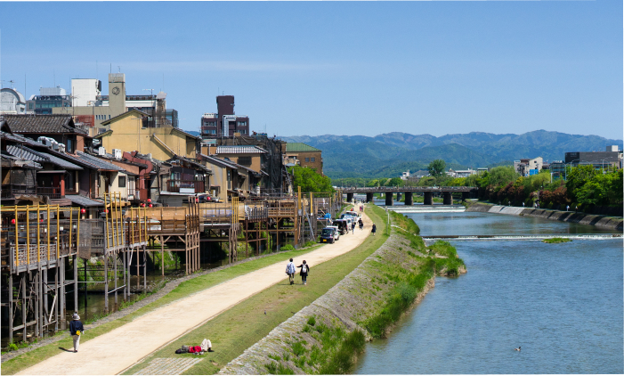 京都市は三方を東山?北山?西山などの山々に囲まれ、それらを源流とした鴨川?桂川?宇治川が流れています。気候は夏と冬ではっきりと気溫が分かれ、暑さ、寒さそれぞれに多少の厳しさはあるものの、ゆえに四季の移ろいは鮮やかで春は桜、夏は深緑、秋は紅葉、冬は雪景色と、三方を囲む山は季節に応じた美しい景観を魅せてくれます。それらに街を流れる川の清らかなせせらぎが合わさり、風光明媚が溶け込んだ暮らしを楽しむことができます。