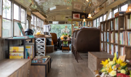 1989年式、黃色いアメリカンスクールバスを改裝した古書店です。バスの座席を數(shù)席殘し、小學(xué)校のロッカー風(fēng)に仕上げた本棚?!副兢瘸龊悉Ψ缶婴虻亭筏郡ぁ工趣いλ激い槊钉堡骏芝氓雪`ラーには、絵本や図鑑、沖縄に関する本などが並びます。「地域交流の場や、多文化?多世代交流の場にする」ため、様々なイベントも。気軽に喫茶利用を。