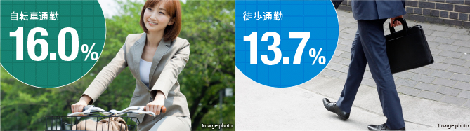 実際に佃居住者122人にアンケートを?qū)g施し、東京都全體の通勤事情と見比べてみると、佃では自転車や徒歩での通勤割合が高いことが浮き彫りに。グラフで見比べてみると、自転車通勤の割合は東京都全體で13.4%に対して、佃居住者は16.0%。徒歩では東京都全體が8.4%であるのに対し13.7%を占めており、職住近接を?qū)g現(xiàn)できる便利な街であると言えるのではないでしょうか。エコで健康的な通勤ができることも、佃の魅力のひとつとなっている。