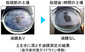 1.1時間で油臭?油膜を解消可能 「オイルバクット工法」は、バイオ(油分解菌)のみでは油臭?油膜の解消に1ヵ月程度要するところを、100種類以上の活性炭から選抜した特殊な活性炭を混合することで、1時間で油臭?油膜を解消することができる新しい油汚染土壌対策工法です。 |
