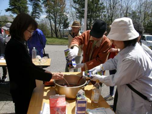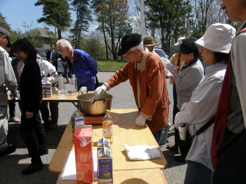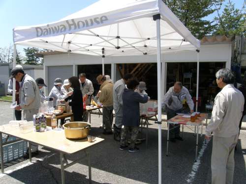 早速、現地事務所前でズメバチほいほい作りを體験。