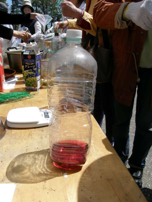誘引剤の材料を混ぜ合わせたら、切込みを入れたペットボトルに注入します。
