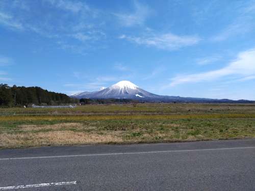 空の水色、山の裾野の青と田畑の緑の組み合わせがきれいですね。