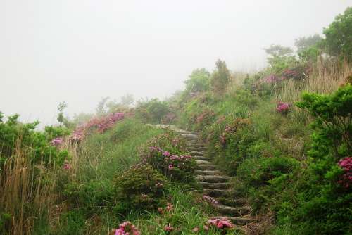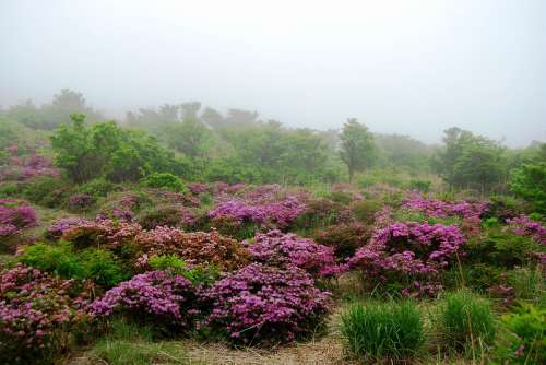 深い山に咲くツツジは霧の中に群れていた-霧島市霧島「中岳探勝路、つつじコース」