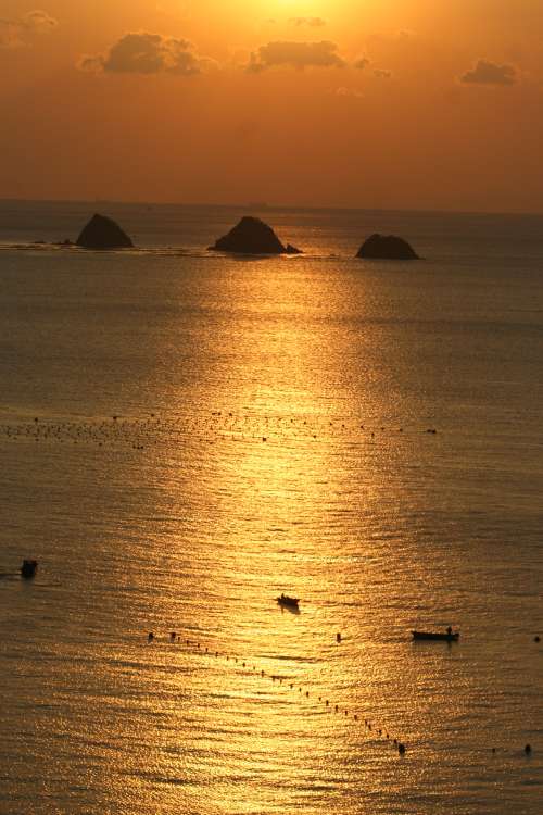 沈む夕日に40mほどの3つの小島がシルエットで浮かび上がる「三ツ畑田島」や、