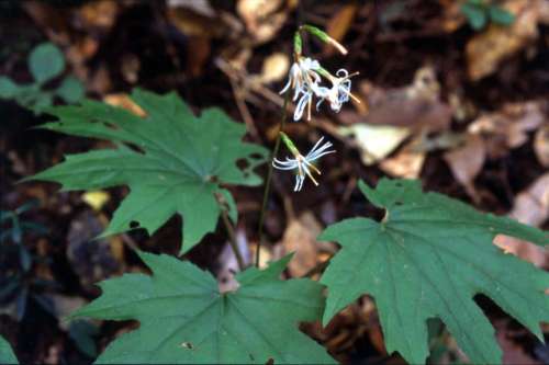 葉はモミジガサ、花はハグマ(羽車)狀です。
