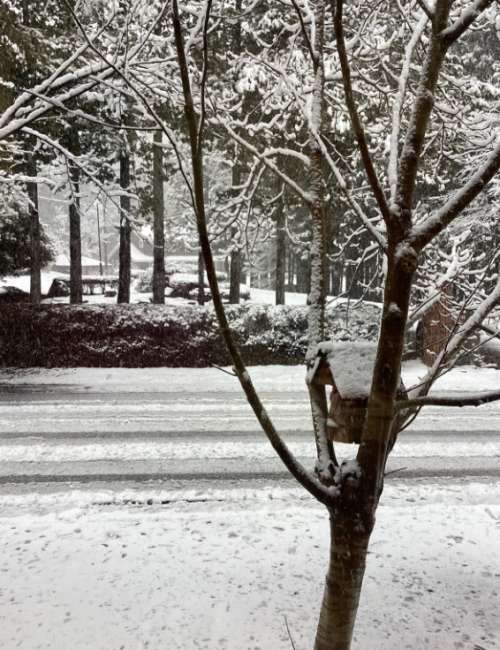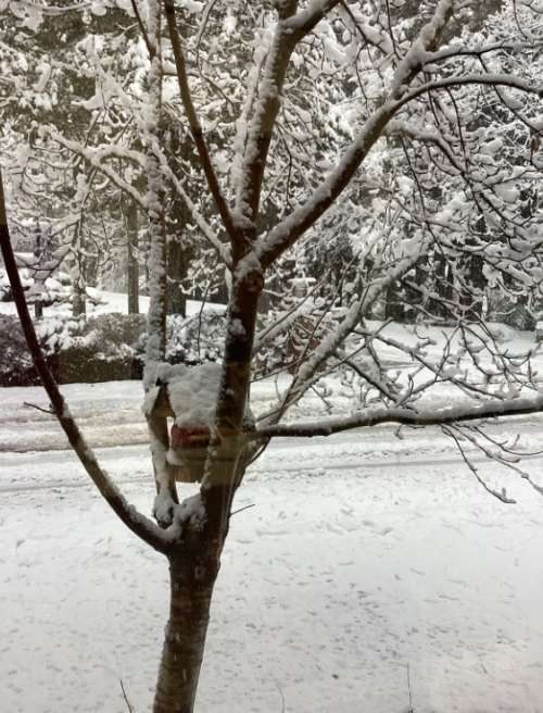 時間後には木の枝についている雪や巣箱の上にも大分雪が積もっています。