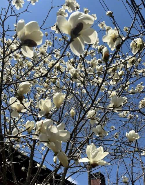 シモクレンはまだ満開とまではいきませんが、ハクモクレンは今が満開です。モクレンはお空に向かって花を咲かせます。