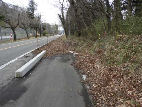 歩いて行く道は、冬とはいえ、観光客等の交通量もそれなりに多い県道なので、気をつけて歩かなければいけないのはもちろんです。広い歩道を歩いているときはよかったのですが、途中からその歩道が途切れ、外側線のみになることがありました。ちょっと歩くと反対側に歩道が出現。安全な歩道を歩くために、何回か橫斷を繰り返しました。両側とは言いませんが、片側でいいから途切れることなく歩道がずっと続いていれば安全なのになあ、と感じました。行政の擔當者を責めるつもりは全くありませんが、整備していただければ、観光客も散策の幅が広がることと思います。