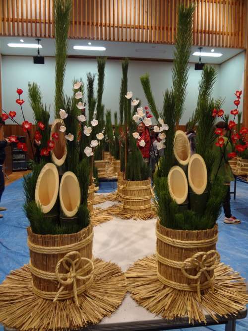 サカキやシキミから松飾りになったのは平安時代の後期に中國で”めでたい“とされていた松が伝わってからだという。????(このころから門松と呼ばれるようになったそうな。) また、竹を使った門松は戦國時代以降だという