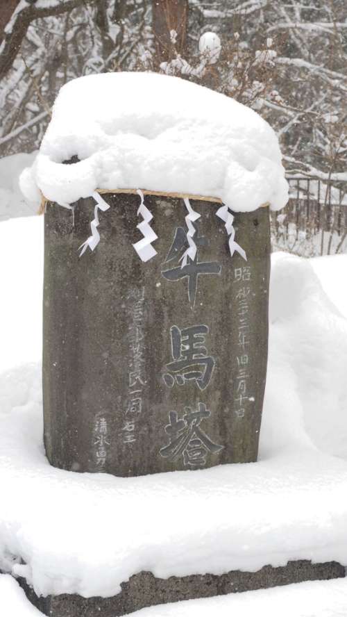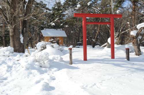 目的地はリゾートから約1㎞ちょっとある“開拓神社” 松川にかかる刈屋橋を渡ってすぐの所にある。雪道を歩いて20分ぐらいである。道は青氷の上に雪が踏み固められており、スパイク付でなければとても歩けない。