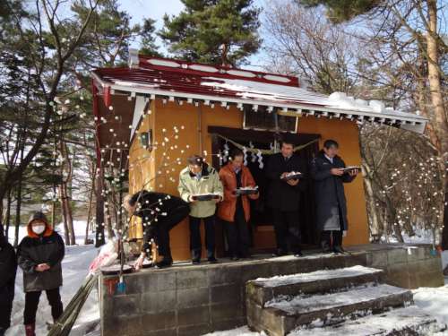 この間に、リゾートの先輩諸氏にもお目にかかり、新たな一年のお導きをお願いした。およそ1時間の行事だった。さて、そろそろ引き上げようかと思った頃、さらなるプレゼント!お持ち帰り用”幸福の餅“ 社の両脇に飾っていたミズキの枝に刺した3色餅(団子)を小さな枝に折って分けてくれた
