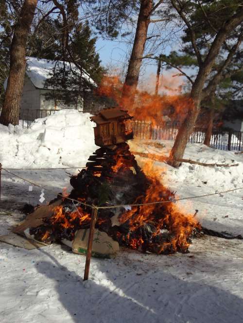 10分前についた時には境內に50~60人ほどの人だかり。境內の真ん中には方形に縄が張られ人の背丈ほどの高さに焚き上げのお札などが積み上げられ、天辺には古い宮形が乗っていた。