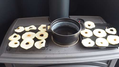 冬は窓の外に“水の化身”がたくさんあるにも拘らず、空気が乾燥し、室內の濕度は30%程度しかない。薪ストーブにはストーブの鍋(ダジャレ!ではなく、おフランス製ストーブ社の鋳物の鍋)を乗せて蒸発させるのだが、なんのその。こんな日の私のお仕事は知る人ぞ知る、“乾物作り”